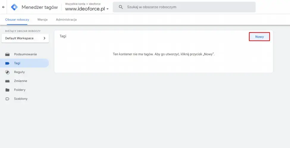 Zacznijmy od tagu konfiguracyjnego. W tym celu przejdź do sekcji Tagi i utwórz nowy Tag.