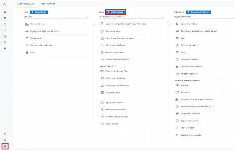 Jeśli posiadasz już konto Google Analytics z usługą Universal Analytics (GA3), przejdź do podstrony „Administracja” i kliknij „Utwórz usługę”.