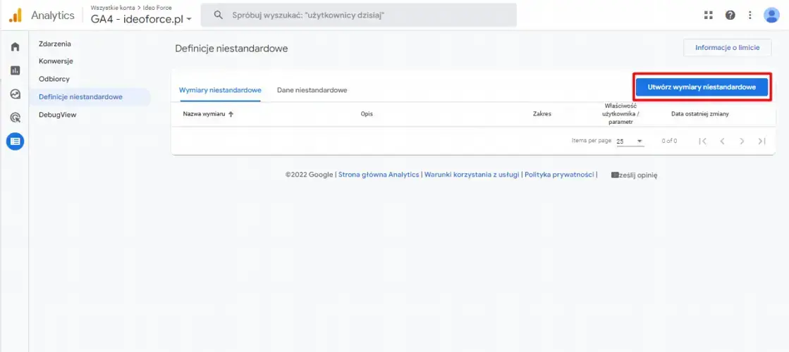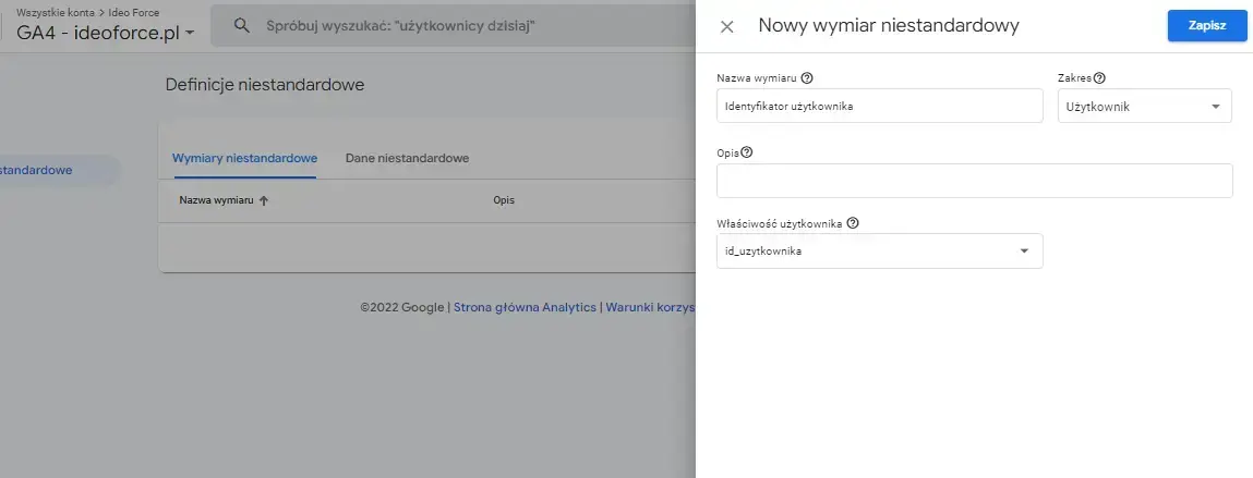 Przejdź do swojej usługi GA4, następnie Konfiguracja -> Definicje niestandardowe -> Wymiary niestandardowe i kliknij „Utwórz wymiary niestandardowe”. Nazwij wymiar np. „Identyfikator użytkownika”, zakres ustaw na „Użytkownik”, a w polu „Właściwość użytkownika” wpisz wcześniej zdefiniowaną w GTMie nazwę, w tym wypadku „id_uzytkownika”. Zapisz.