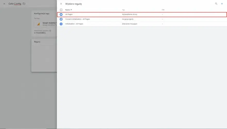 W polu „Tag konfiguracji” wybierz wcześniej utworzony tag i wprowadź nazwę zdarzenia. Pamiętaj, że niektóre zdarzenia takie jak zakup czy logowanie powinny posiadać nazwy zgodne z wytycznymi Google: https://support.google.com/analytics/answer/9267735, inne zaś przy włączonym pomiarze zaawansowanym śledzone są automatycznie po zaimplementowaniu tagu konfiguracyjnego: https://support.google.com/analytics/answer/9216061.