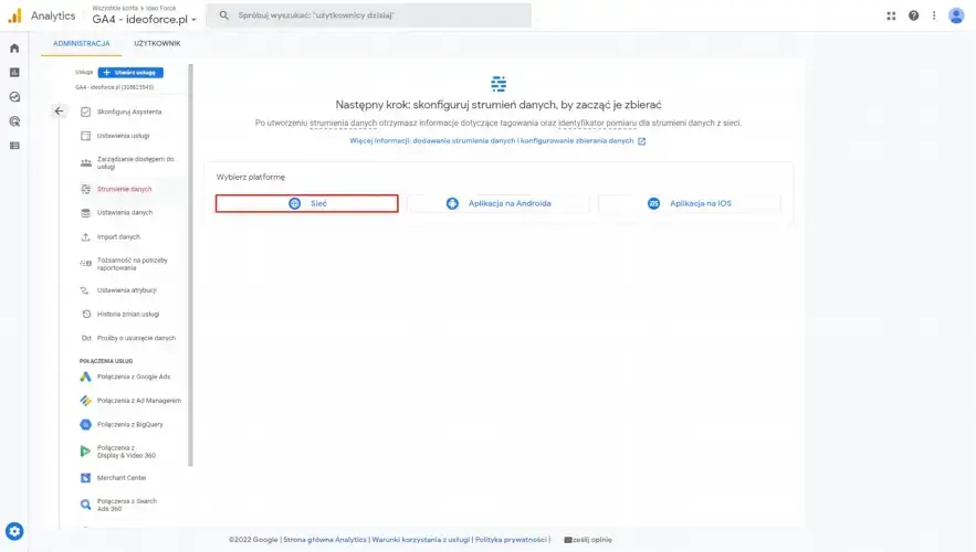 GA4 w przeciwieństwie do GA3 nie posiada widoków, ich miejsce w strukturze konta zajęły strumienie danych, czyli w skrócie źródła, z których dane przesyłane są do Google Analytics. Nowa usługa pozwala na skonfigurowanie strumieni danych z 3 platform: Witryny, Aplikacji na Androida oraz Aplikacji na IOS. Dziś pominiemy aplikacje i skupimy się jedynie na witrynie internetowej. Przejdź więc do konfiguracji platformy „Sieć”.