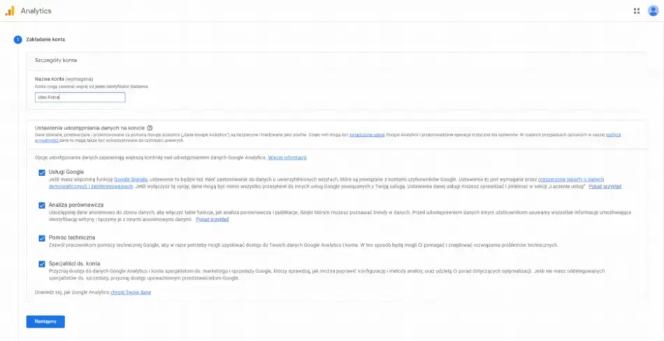 Po kliknięciu przycisku „Rozpocznij pomiary”, wpisz nazwę swojego konta, a następnie przejdź do konfiguracji usługi.
