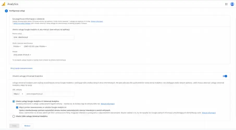 Wpisz nazwę usługi (przed nazwą właściwą warto dodać skrót reprezentujący rodzaj usługi np. GA4, UA), podaj swoją strefę czasową oraz walutę, którą chcesz posługiwać się w raportach. W zależności od czasu, w jakim czytasz artykuł, możesz posiadać opcję utworzenia równolegle usługi Universal Analytics, w tym celu rozwiń opcje zaawansowane, przesuń suwak w prawej części i uzupełnij wymagane dane. Wypełnij krótką ankietę (możesz ją również pominąć), a następnie kliknij przycisk „Utwórz”. Po zaakceptowaniu regulaminu Twoje konto Google Analytics (jeśli wcześniej go nie posiadałeś) oraz usługa GA4 zostaną utworzone.