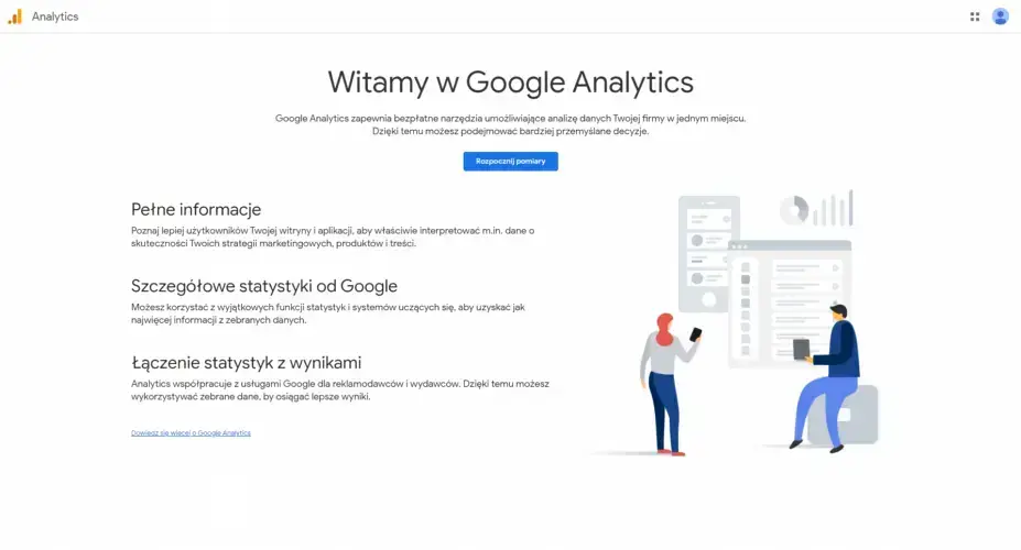 Jeśli jeszcze nie posiadasz konta Google Analytics, musisz je założyć. To warunek, który trzeba spełnić, aby wdrożyć najnowszą wersję oprogramowania do swojej witryny. W celu założenia konta skorzystaj ze strony https://analytics.google.com/.