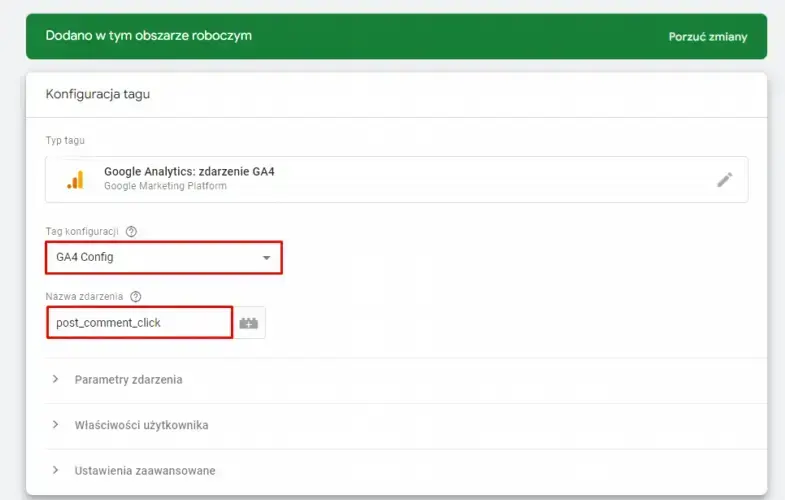 Dodaj odpowiednią regułę, nazwij tag i zapisz. Zdarzeniom możesz również dodać określające je parametry i/lub parametry użytkownika, który tego zdarzenia dokonał.