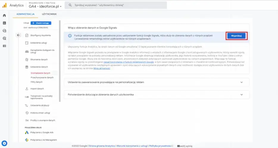 Zanim przejdziemy do instalacji tagu, przejdź do Administracja > Ustawienia danych > Gromadzenie danych i włącz Google Signals.