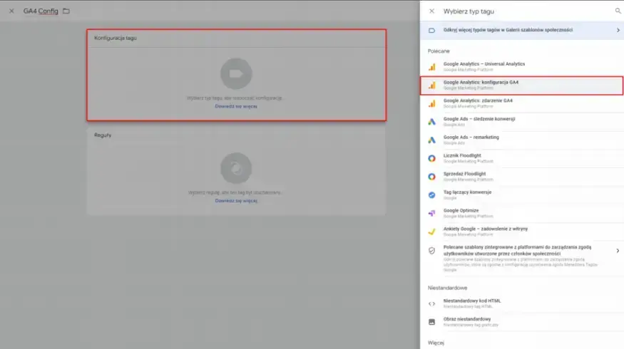Wpisz nazwę, kliknij w konfigurację tagu i wybierz typ tagu: „Google Analytics: konfiguracja GA4”.