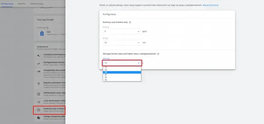 Przechodząc do swojego strumienia danych w sekcji „Strumienie danych”, a następnie klikając w Skonfiguruj ustawienia tagów -> Dostosuj czas trwania sesji, możesz również zmienić czas, po jakim sesja ma być uznana za sesję z zaangażowaniem.