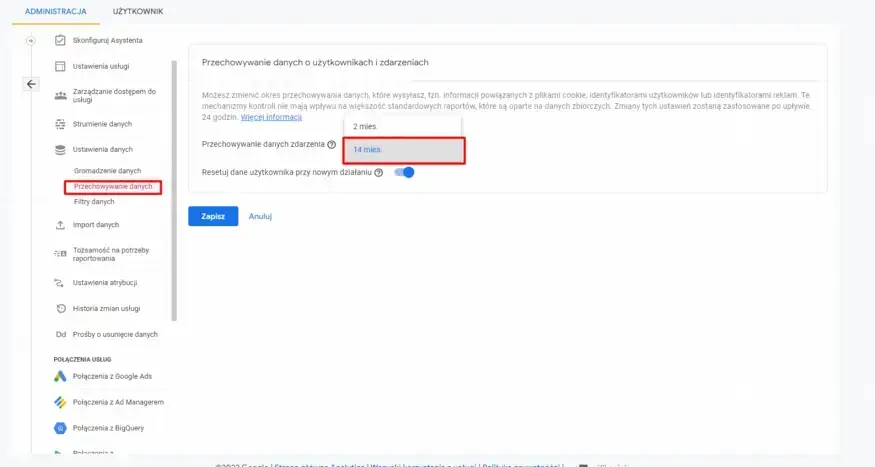 W sekcji Administracja -> Ustawienia danych -> Przechowywanie danych, koniecznie zmień okres przechowywania na 14 miesięcy.