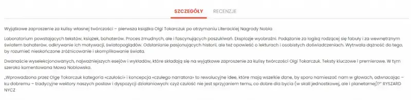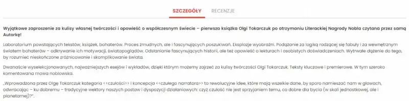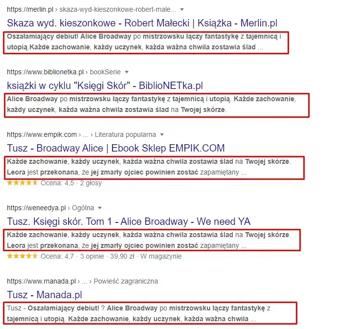Od razu możemy zauważyć, że ciężko będzie się nam wbić ze swoim wynikiem między topowe księgarnie takie jak empik, czy stronę wydawcy. Warto więc zainwestować czas w stworzenie dobrej jakości opisu, który będzie oryginalny i unikalny. Dzięki temu zyskamy w oczach Google na tej płaszczyźnie, oraz będziemy mieli szansę na wypozycjonowanie się na inne/ dodatkowe frazy niż konkurencja.