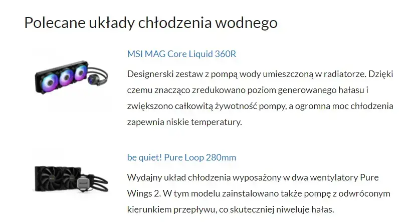 W swoim wpisie dotyczącym układów chłodzenia utworzyli atrakcyjnie wizualne linki do produktów w swoim sklepie, dzięki czemu, klient zainteresowany kupnem może bez szukania sprowadzić konkretne produkty, które dodatkowo spełniają kryteria opisane w artykule.