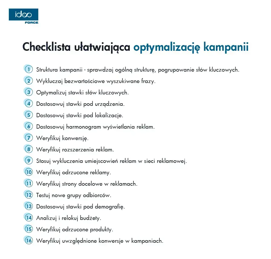 Poniżej znajdziesz podstawową checklistę do przeanalizowania, która może ułatwić Ci optymalizację kampanii. Zwróć uwagę na: