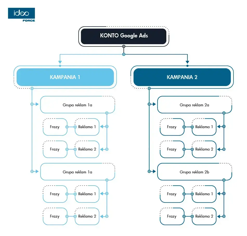 Taka struktura znacznie ułatwia zarządzanie kontem, ale także pozwala zachować powiązanie treści reklam z frazami oraz stroną docelową, dzięki czemu reklamy będą wyświetlać się odpowiednim osobom, we właściwym czasie i miejscu.