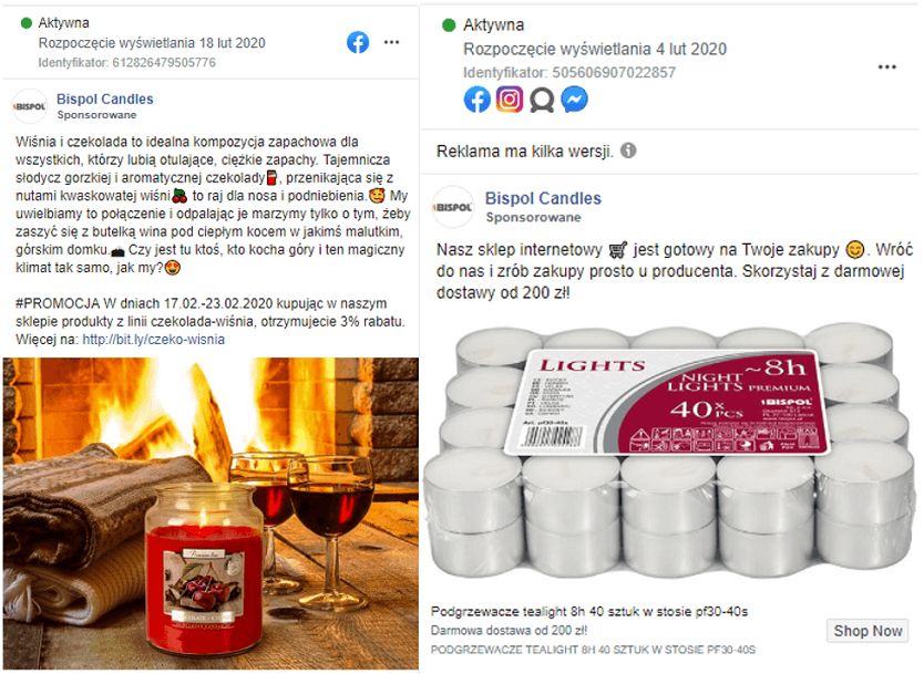 Dla przykładu można sprawdzić, czy i jak reklamuje się na Facebooku firma „Bispol Candles”. W momencie pisania tego artykułu profil ten miał 14 aktywnych reklam.