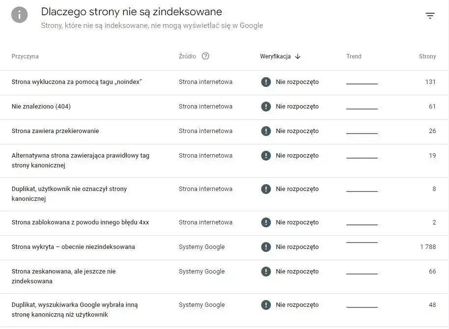 W narzędziu Google Search Console dostępny jest dokładny wykaz zaindeksowanych i niezaindeksowanych stron w sklepie, a także podane przyczyny braku indeksacji.