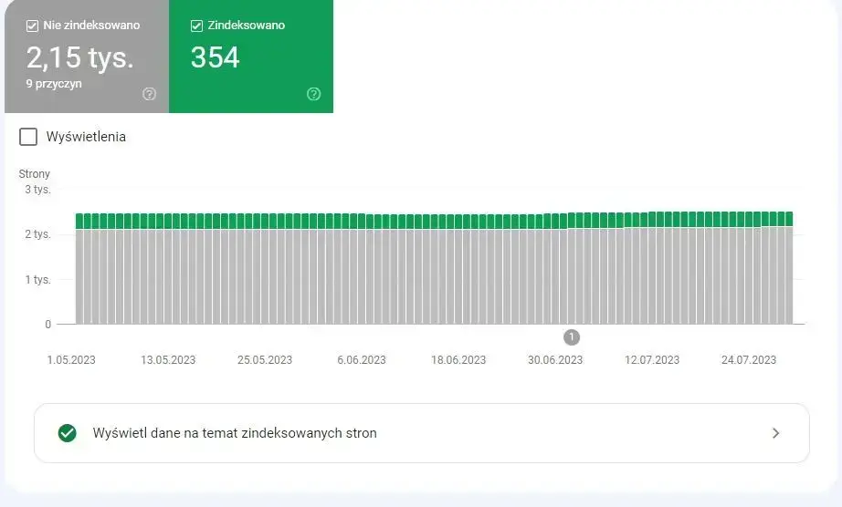 W Google Search Console w raporcie „Statystyki indeksowania” można znaleźć szczegółowe informacje na temat stanu indeksacji sklepu. W menu po lewej pod „Indeksowanie” w zakładce „Strony” znajduje się wykaz wszystkich adresów witryny. Na zielono oznakowane będą adresy URL zaindeksowane, a na szaro niezaindeksowane. Poniżej znajduje się wykaz możliwych przyczyn braku indeksacji. Warto się temu przyjrzeć, aby sprawdzić, które błędy można wyeliminować, celem poprawy indeksowania.