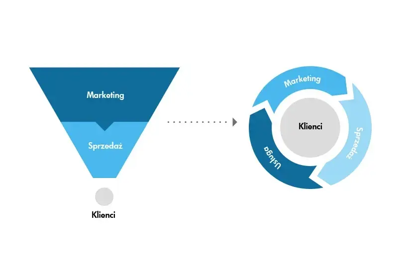 Jednak wszystko uległo zmianie wraz z popularyzacją sieci. Konsumenci zaczęli wyszukiwać informacji o marce na stronach niezależnych, nienależących do marki. Coraz większą popularnością zaczął się cieszyć marketing szeptany, a rekomendacje osób postronnych i znajomych czy rodziny miały większą wartość niż tradycyjny przekaz reklamowy. Początkowo prym objął, do niedawna jedyny znany nam model marketingowy, jakim jest lejek (sales funnel). Najważniejsza była sprzedaż, a to, czy klient faktycznie potrzebował naszego produktu, czy był zadowolony oraz czy w ogóle używał zakupionego produktu nie było nawet brane pod uwagę. Potrzeby ani cechy konsumentów nie miały większego znaczenia, liczyło się tylko to, aby wygenerować jak największą ilość klientów i sprzedanych produktów. Niestety, takie podejście często skutkowało niezadowolonymi, jednorazowymi klientami, wysokimi kosztami nabycia i stosunkowo niską wartością klienta w całym okresie użytkowania. W konsekwencji, lejek zaczął zawodzić. To właśnie wtedy z pomocą przyszedł model koła zamachowego.