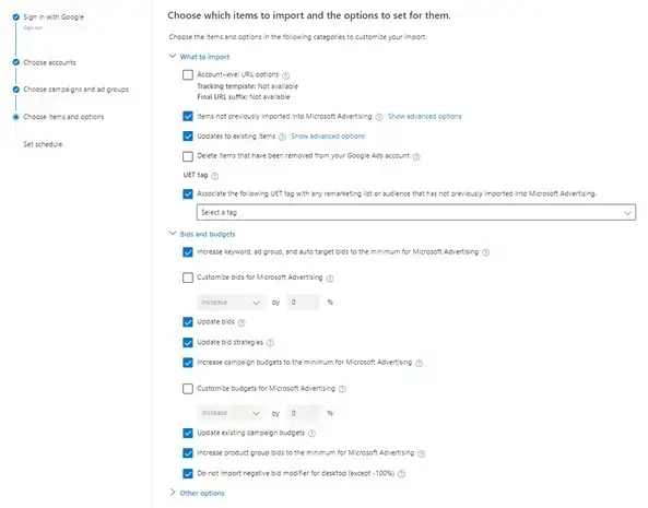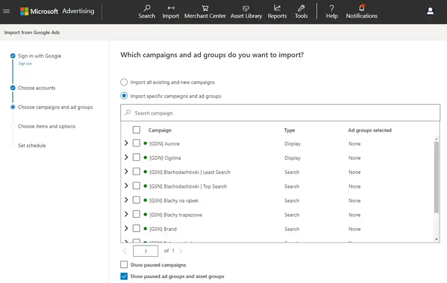 Krok 5. Ustalenie grup reklamowych oraz słów kluczowych, które mają zostać zaimportowane.