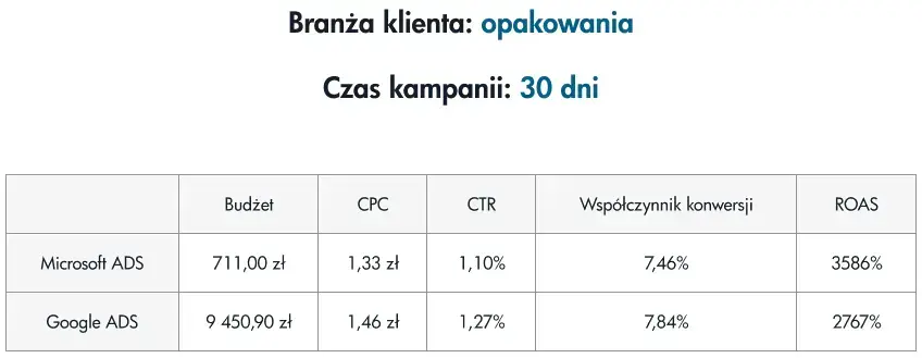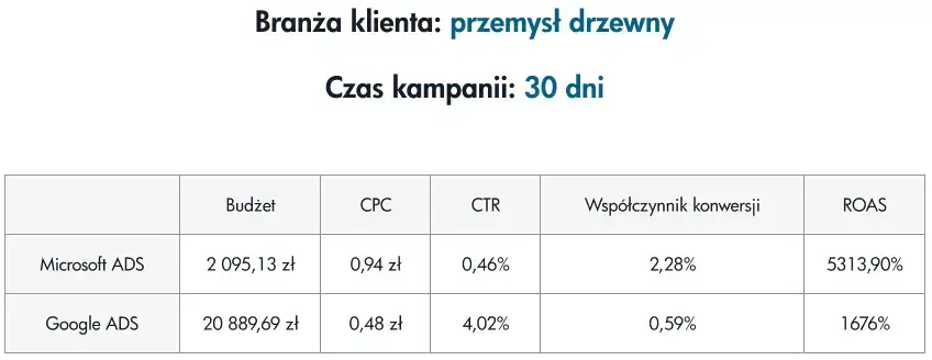 Poniżej prezentujemy kilka przykładów, obrazujących wysokość budżetów reklamowych, które nasi klienci z branży B2B, przeznaczają na prowadzenie działań zarówno w ekosystemie Microsoft Advertising, jak i Google Ads. Prezentujemy także wartości ROAS, uzyskiwane z tychże kampanii.