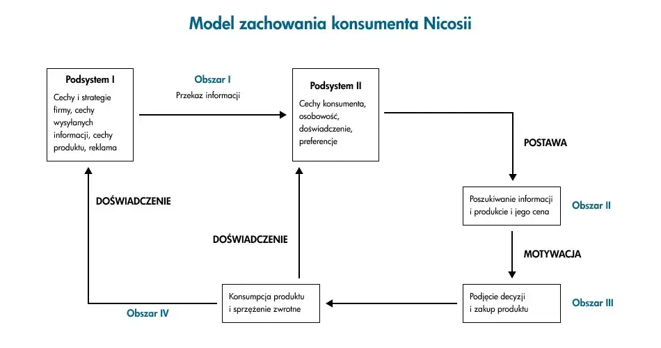 Model Nicosii odnosi się do procesu decyzyjnego, przez który przechodzi klient, przedstawiając interaktywne związki, jakie zachodzą pomiędzy przedsiębiorstwem a konsumentem. Wiele opiera się tutaj na wzajemnej komunikacji. Firma komunikuje się z klientami poprzez działania promocyjne, zaś nabywcy poprzez zakupy. W swoim modelu F.M. Nicosia wyróżnił kilka faz, przez które przechodzi konsument, zaliczając do nich predyspozycje (preferencje), postawy i motywacje. Jak wygląda szczegółowy przebieg tego procesu? Przyjrzyjmy się 4. kluczowym obszarom, opisującym poszczególne kroki na ścieżce decyzyjnej, na które została ona podzielona.