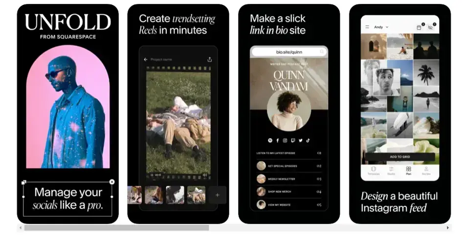 Unfold to jedna z najbardziej znanych aplikacji. To prosty edytor zdjęć, w którym znajdziemy ok. 400 gotowych szablonów do tworzenia relacji. Pozwala na personalizację stories za pomocą efektownych filtrów czy stylowych fontów. Aplikacja umożliwia na dodawanie nie tylko zdjęć, ale i filmów.