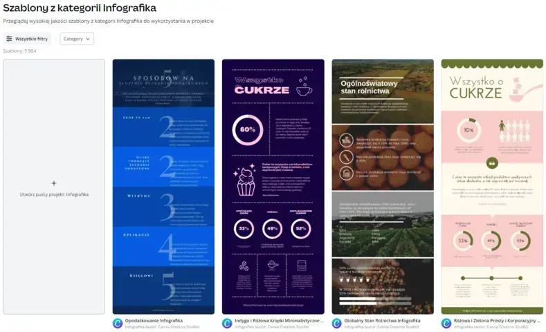 Canva to jedno z najbardziej popularnych narzędzi online do projektowania graficznego, jednak ze względu na naprawdę wiele możliwości związanych z tworzeniem infografik, warto wspomnieć o niej właśnie w tym kontekście.