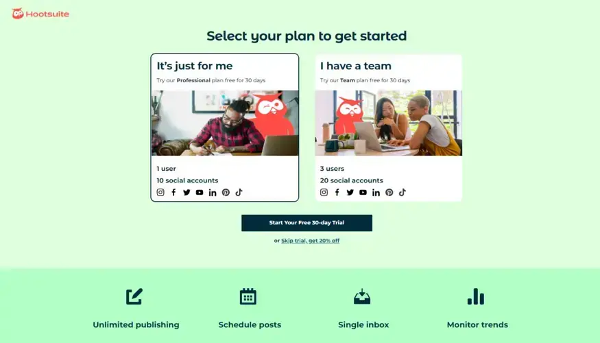 Hootsuite to złożona platforma, którą zdecydowanie warto choćby przetestować. Na początek można skorzystać z 30-dniowego, darmowego okresu próbnego. Należy tylko wybrać 1 z 2. dostępnych planów.