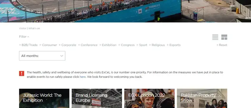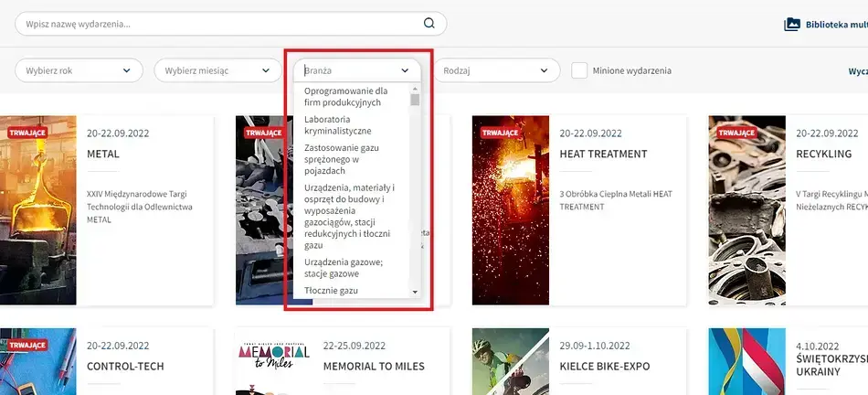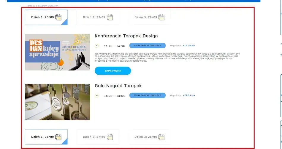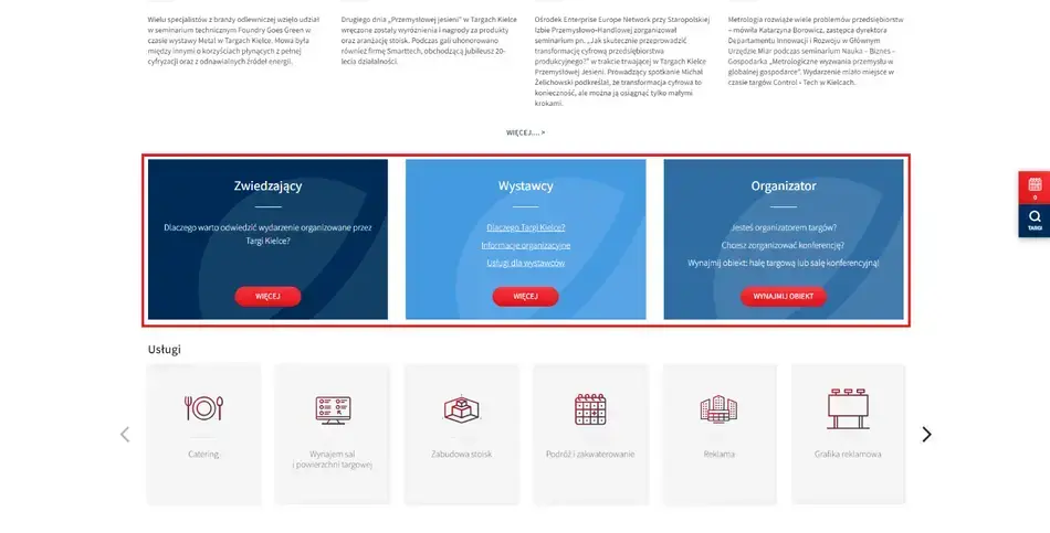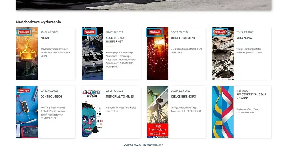Niezależnie od tego, które ścieżki dominują na danej stronie, warto wyeksponować na niej jedną z najważniejszych dla branży eventowej i targowej sekcji – najbliższe wydarzenia. To właśnie w tej sekcji użytkownicy najczęściej poszukują kluczowych dla siebie informacji. W tym zakresie dobrze więc zadbać o: