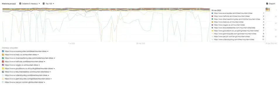 Co więcej, otrzymujemy historię zmian pozycji stron konkurencji, na podaną przez nas frazę z TOP 10 do TOP 100.