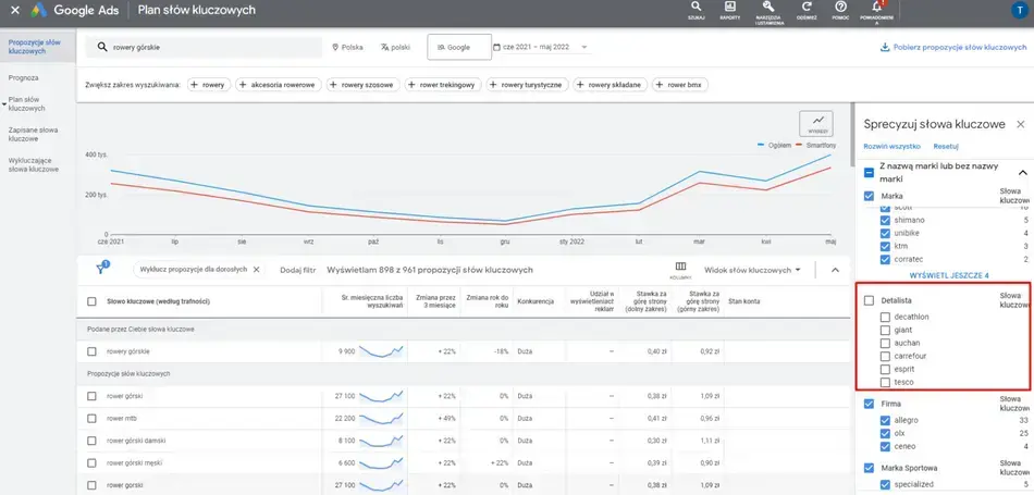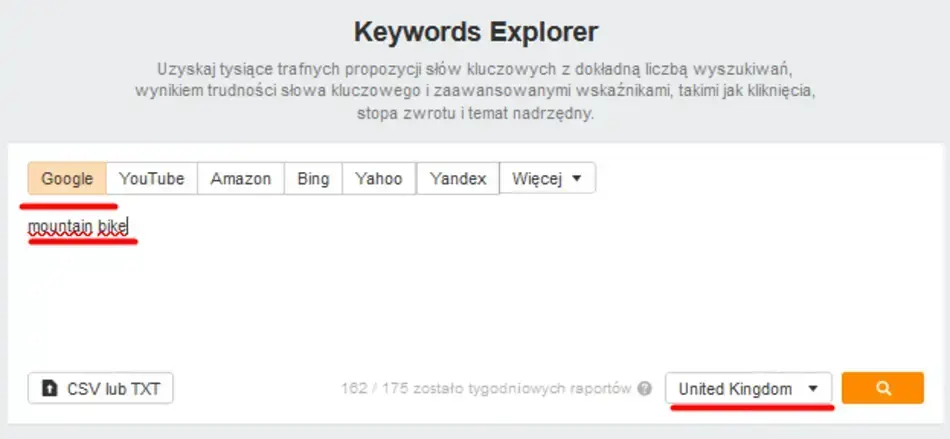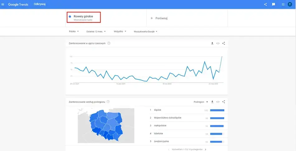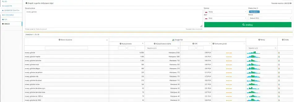 Chcąc dokonać analizy, wystarczy w odpowiednie pole wpisać naszą frazę, wybrać kraj oraz kliknąć wyszukaj. Jednocześnie możemy zweryfikować do pięciu fraz. Warto jednak pamiętać, aby były zbliżone tematycznie np.: rowery górskie, damskie rowery górskie, męskie rowery górskie, rowery MTB i podobne.