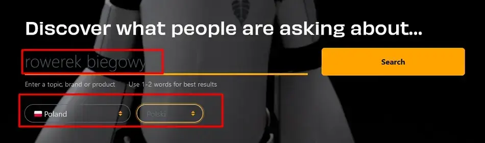 Aby rozpocząć swoje poszukiwania musimy na samym początku wybrać język i kraj, w którym narzędzie ma poszukiwać dane. Następnie podajemy naszą frazę i klikamy search.