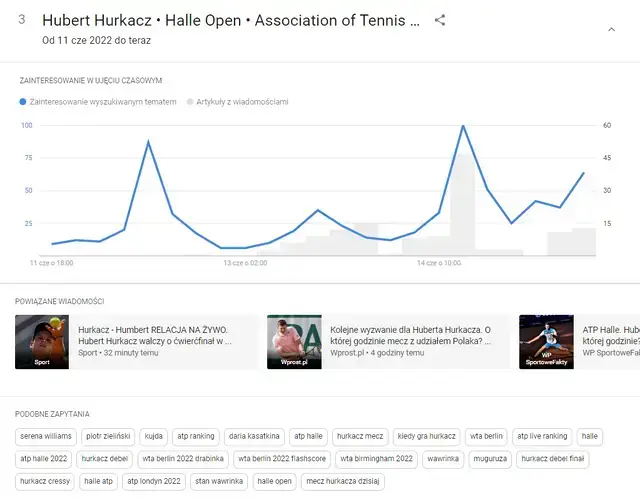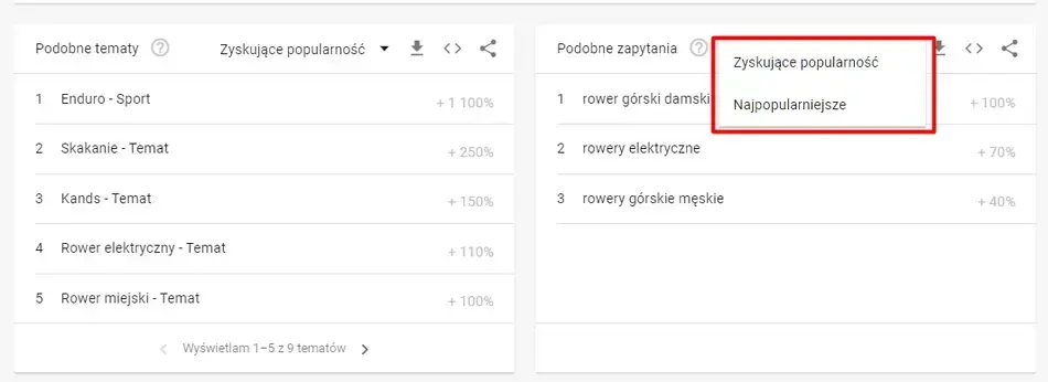 Korzystając z tej opcji, możemy również poznać podobne do naszego zapytania tematy oraz zyskujące na popularności i popularne zapytania.