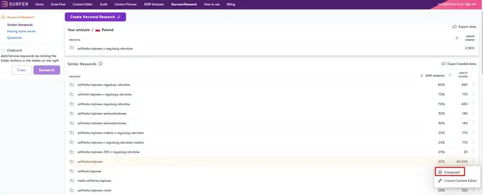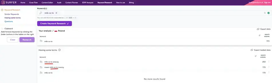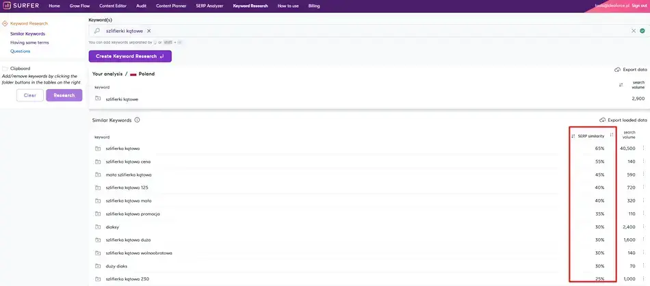 Jedną z opcji Surfera, która ułatwia poznanie wartościowych słów kluczowych, jest Keyword Research. Działanie tej funkcjonalności oparte jest na porównaniu naszego słowa kluczowego z konkurencją i wyświetleniu pozostałych słów kluczowych, na które wyświetlają się konkurenci. Dzięki temu mamy szansę tak dooptymalizować stronę, aby również wyświetlać się w wynikach organicznych na te frazy, co konkurencja. Korzystając więc z Keyword Research, otrzymujemy mnóstwo słów kluczowych o podobnym znaczeniu do tych, które wpisaliśmy w narzędzie. Wyniki podzielone są na trzy grupy: