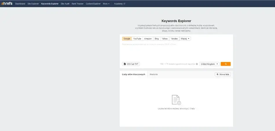 W celu przeprowadzenia analizy słów kluczowych należy wybrać opcję Keyword Explorer z głównego menu Ahrefs.