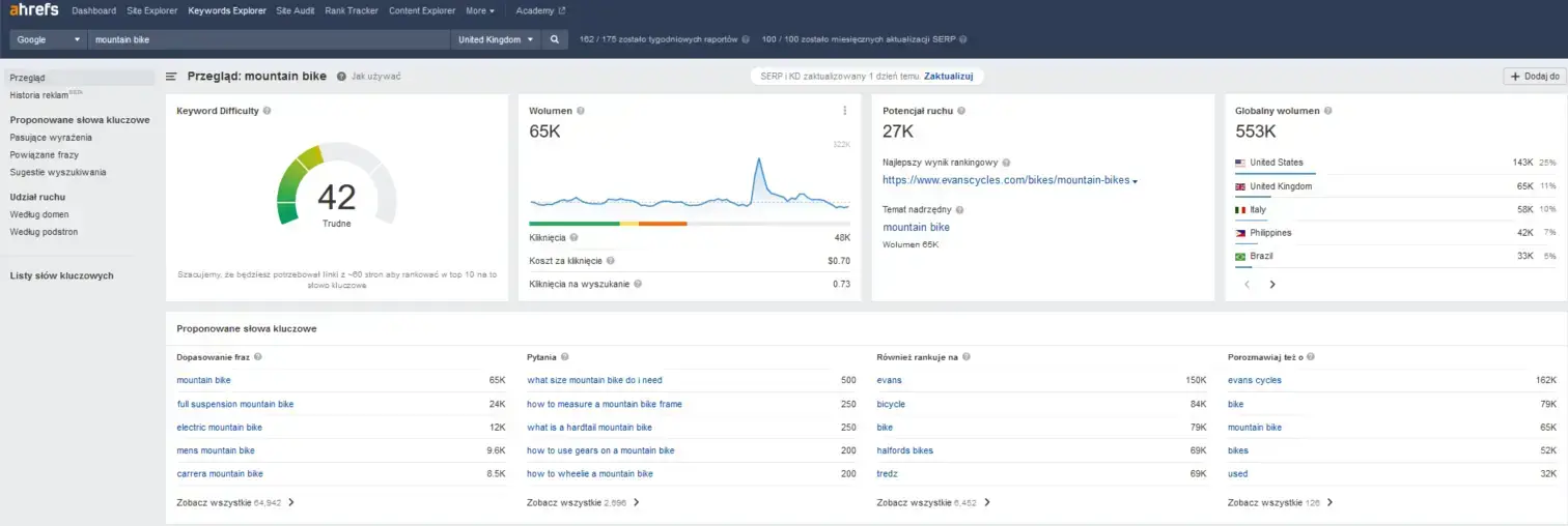 Ahrefs to jedno z ważniejszych narzędzi wykorzystywanych przez specjalistów SEO. Zazwyczaj stosowane jest do audytowania stron, a także do analizy profilu linkowania. Niemniej jednak szereg różnych funkcji, może być także śmiało wykorzystywany przez copywriterów. Mowa tu o funkcjonalności Keyword Explorer. Ahrefs jest oczywiście narzędziem płatnym dostępnym w kilku pakietach oferujących różnorodne opcje.