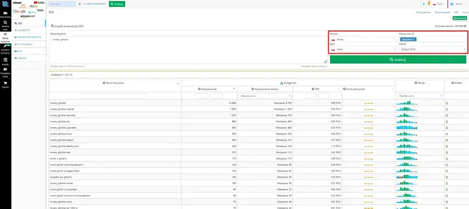 Następnie określamy wyszukiwarkę, na której nam zależy, wpisujemy słowa kluczowe i wybieramy kraj, dla którego chcemy przeprowadzić analizę.