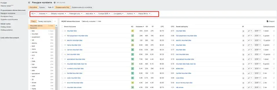 Dzięki odpowiednim filtrom możemy szybko odnaleźć pożądane słowa kluczowe. Filtry umożliwiają odnalezienie fraz o odpowiednim wolumenie wyszukiwań, czy trudności słowa kluczowego. Można je również łączyć w celu zawężenia wyników.