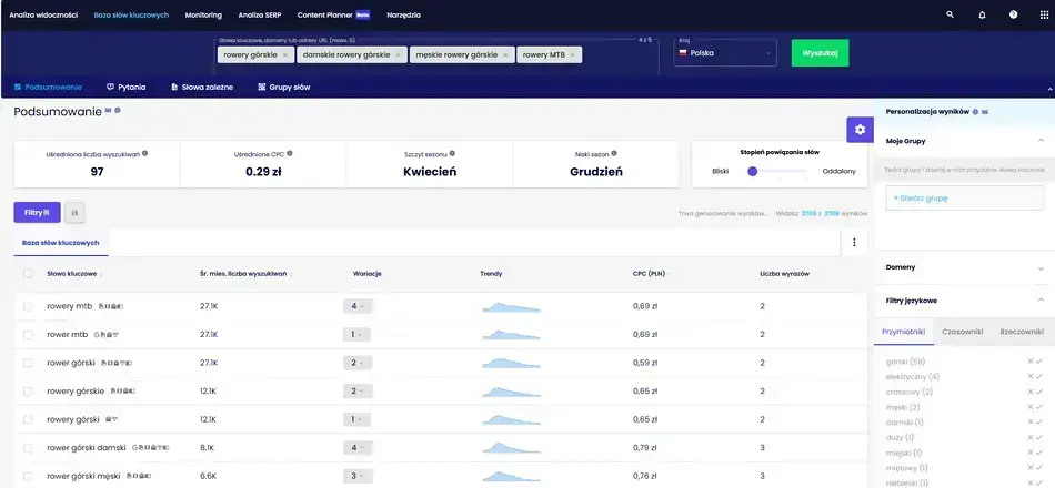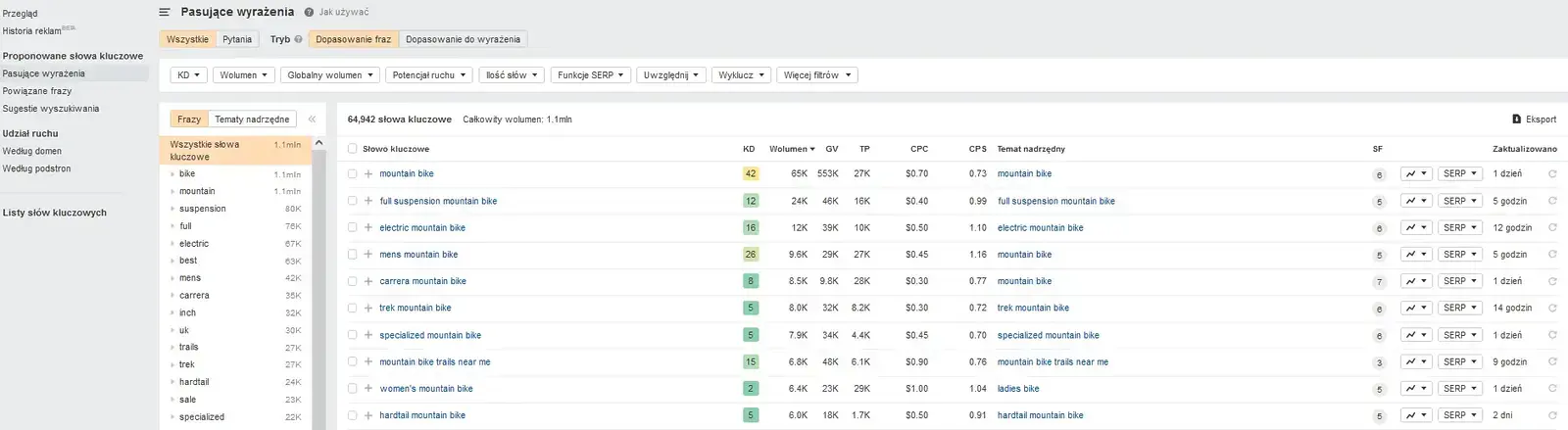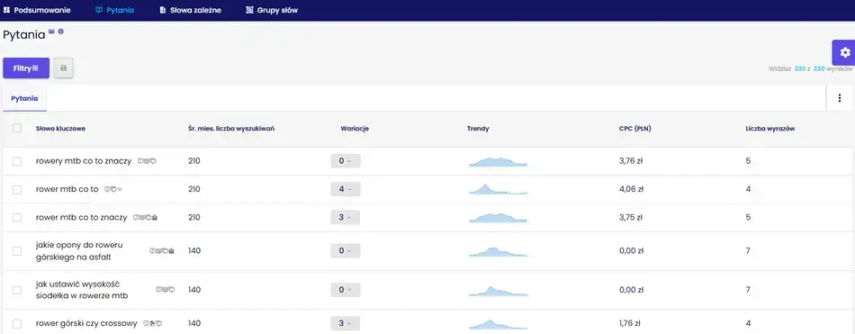 Otrzymane wyniki mamy możliwość odfiltrować na wiele sposobów, co znacznie ułatwia odnalezienie najbardziej wartościowych dla nas fraz.