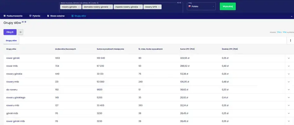 Grupy słów to narzędzie, za pomocą którego można zweryfikować zbitki wyrazowe, jakie najczęściej pojawiają się w kontekście wyszukiwanej frazy kluczowej. Po wprowadzeniu przez nas pożądanej frazy algorytm generuje wszystkie frazy powiązane z tą wpisaną przez użytkownika. Następnie system dzieli je na grupy słów powiązanych na poziomie językowym.