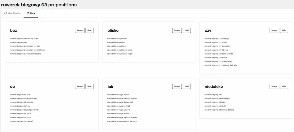 Otrzymujemy wyniki z takich wyszukiwarek jak Google i Bing, w formie kołowego wykresu i listy słów kluczowych z przyimkami oraz zbiór pytań ułożonych alfabetycznie.