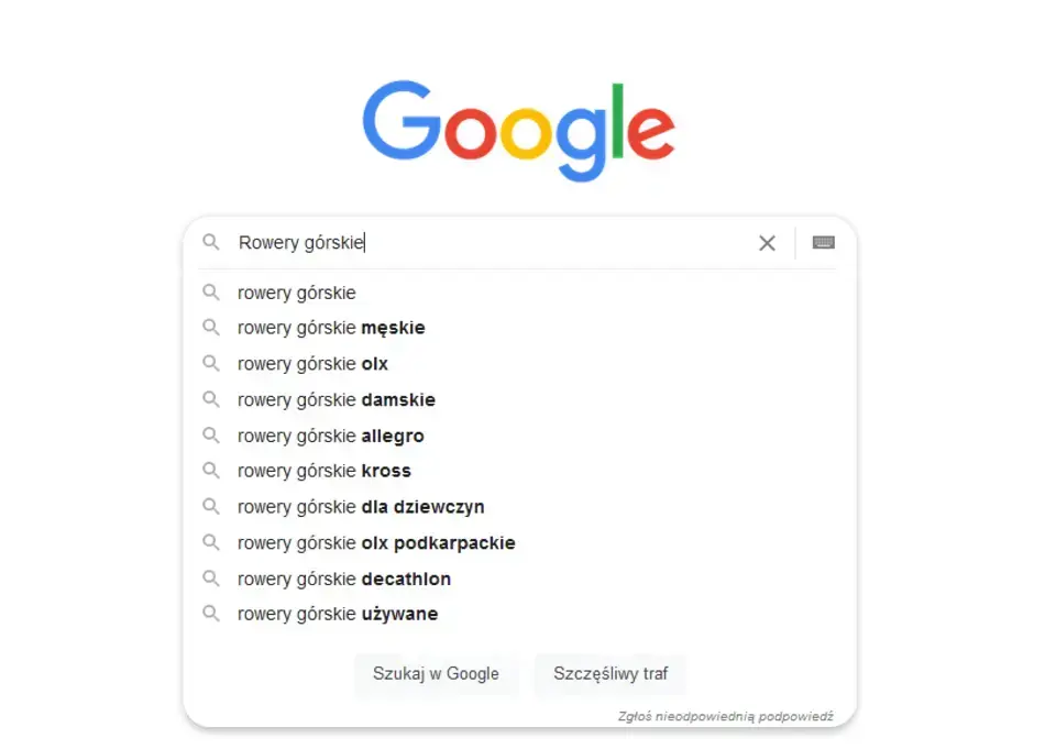 Kolejnym wartościowym i darmowym narzędziem są same podpowiedzi wyszukiwarki Google. One również oparte są na konkretnych informacjach, które posiada wyszukiwarka. Google nie podpowiada nam byle czego, tylko wskazuje najbardziej zbliżone, do naszego zapytaniasłowa kluczowe. Niestety korzystając z tych podpowiedzi, nie otrzymamy dokładnej liczby wyszukiwań dla danego zapytania. Niemniej jednak można te frazy wykorzystać jako uzupełniające do opisu kategorii bądź do stworzenia nowej publikacji na blogu.