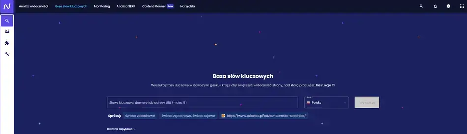 Senuto jest to polskie narzędzie płatne, bardziej rozbudowane niż Planer Słów Kluczowych, ale równie proste i intuicyjne w obsłudze. Darmowy okres próbny trwa tylko 14 dni, ale to w zupełności wystarcza, aby poznać podstawowe funkcje. Senuto oferuje wiele ciekawych rozwiązań ułatwiających działania pozycjonerskie, takie jak analiza widoczności, baza słów kluczowych, monitoring oraz analiza SERP. My jednak na potrzeby artykułu skupimy się na bazie słów kluczowych.