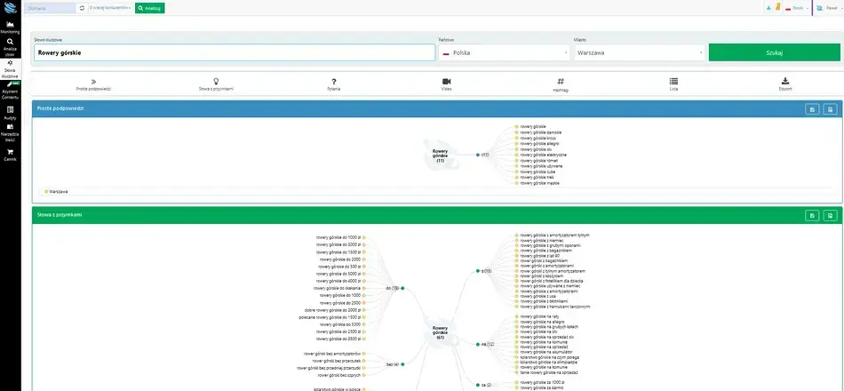 Otrzymamy w ten sposób zestawienie fraz kluczowych podzielonych na kategorie, takie jak: Proste podpowiedzi, Słowa z przyimkami, Pytania, Video, Lista wszystkich słów kluczowych.