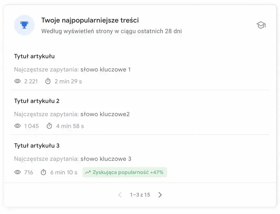 Jeżeli artykuł jest już widoczny w wynikach wyszukiwania, prowadzą do niego słowa kluczowe. Tu do standardowego już zestawu wyświetlenia/średni czas pojawia się jeszcze liczba kliknięć.