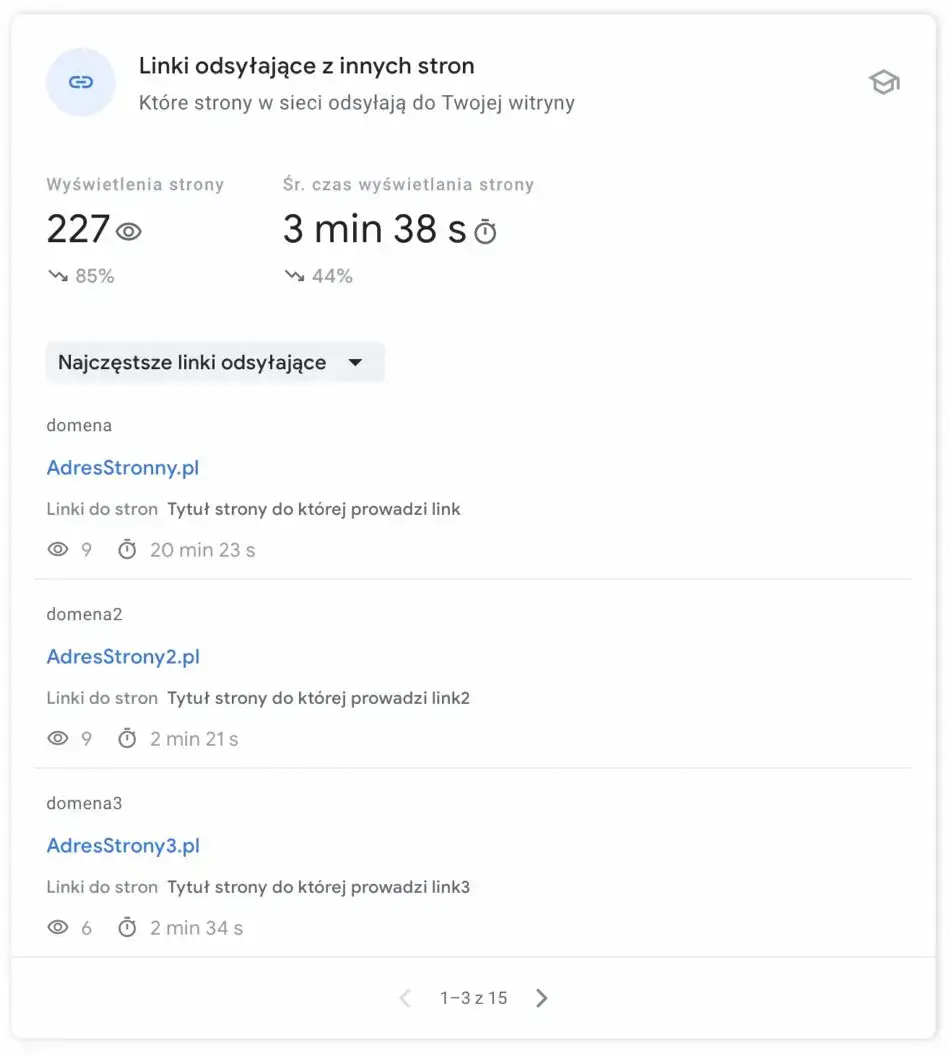 Kolejna sekcja zawiera „Linki odsyłające z innych stron” z podziałem na: