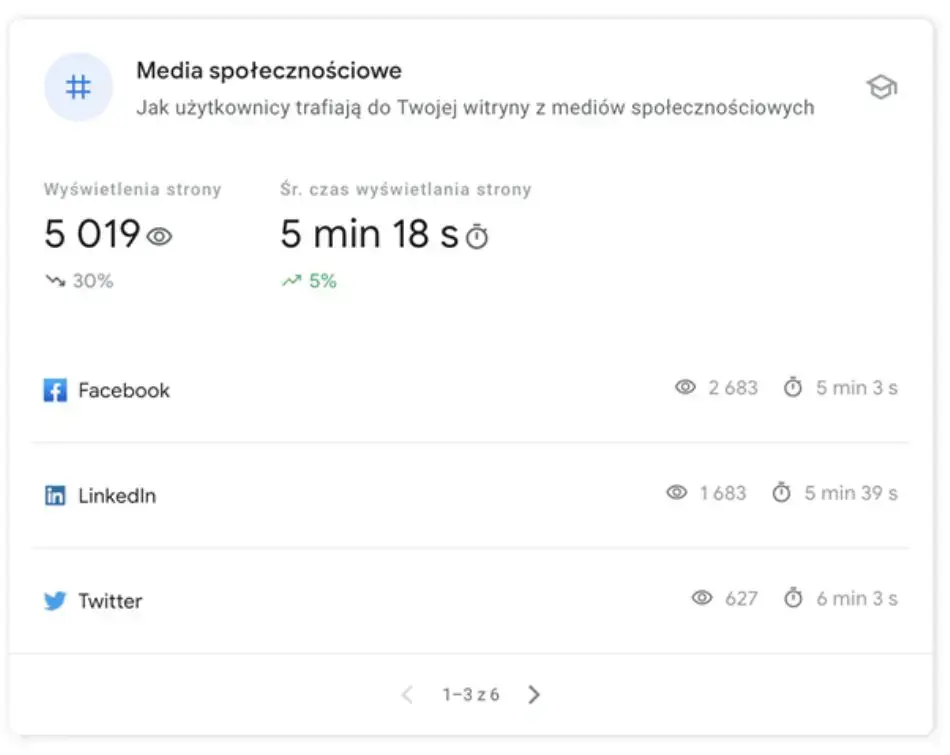 Ostatnia sekcja dotyczy mediów społecznościowych. Dane w niej zawarte wyglądają identycznie jak w sekcji dotyczącej linków odsyłających. Z tą tylko różnicą, że informacje odwołują się do statystyk Facebooka, Linkedina oraz wyświetleń i średniego czasu na stronie, jaki wygenerowały.