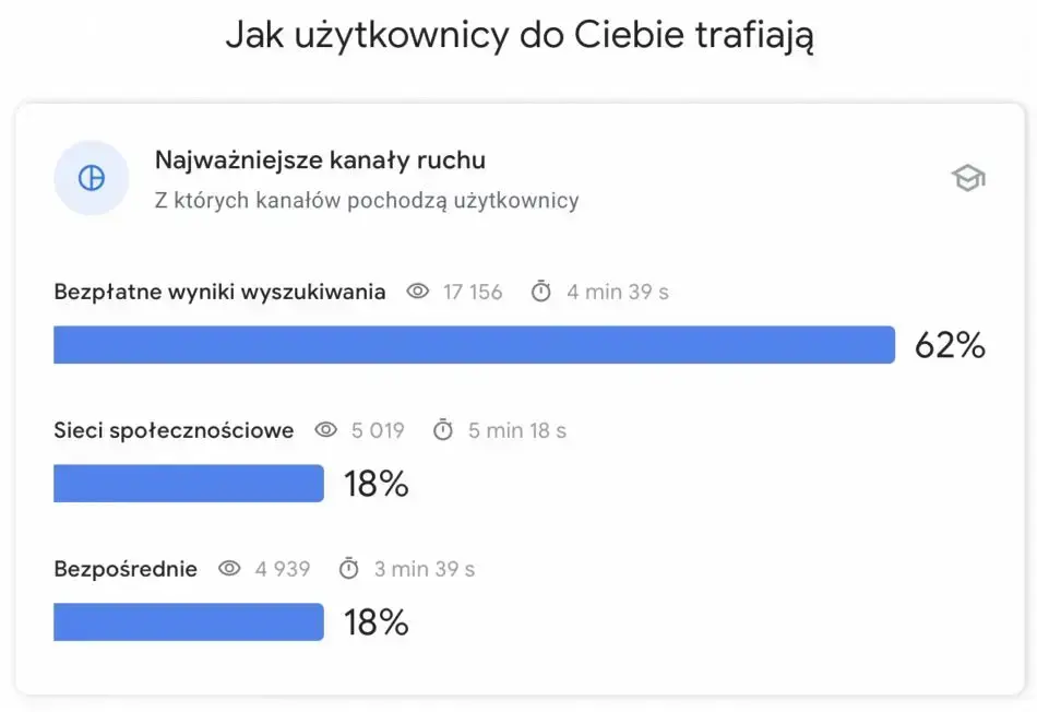 W kolejnej sekcji zatytułowanej „Jak użytkownicy do Ciebie trafiają”, dowiadujemy się jakie są „Najważniejsze kanały ruchu” dla danej publikacji. Tu dane są prezentowane liczbowo z podziałem np. na: