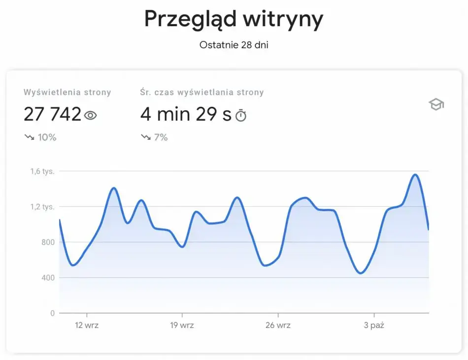 Jest to pierwsza informacja jaką zobaczymy. Posiada ładną oprawę w postaci błękitnego prostokąta z wielkimi cyframi. Problem jednak w tym, że nie do końca wiem co te „Wyświetlenia strony ogółem” oznaczają. Próba zestawienia tej liczby z wyświetleniami w Google Search Console oraz Google Analytics - spełzły na niczym. Nie za bardzo jest to również gdzieś opisane. Pocieszający jest jednak fakt, że dane te nie są specjalnie interesujące, mają bardziej charakter „miary próżności” - fajnie że rośnie, ale przełożenia brak.