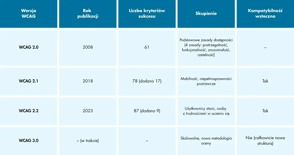 Od kiedy WCAG 2.2? Oficjalnie opublikowane we wrześniu 2023 roku, stał się wymogiem prawnym w Polsce od 28 czerwca 2025 roku. Nowe regulacje wynikające z Polskiego Aktu o Dostępności sprawią, że każda firma działająca w sektorze e-commerce, bankowości czy wydawnictw cyfrowych będzie musiała wdrożyć standard WCAG 2.2.