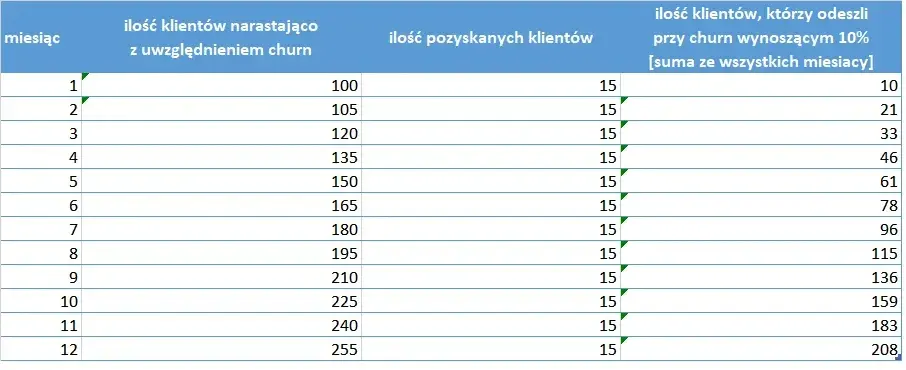 Wspomniane 10% utraty klientów nie wydaje się dużą liczbą jeśli weźmie się pod uwagę, że każdego miesiąca firma zdobywa też nowych klientów, ale jak pokazałem to na poniższej tabeli w skali roku odpływ klientów może być ogormny. W tabeli starałem się pokazać co się dzieje jeśli firma regularnie zdobywa 15 nowych klientów miesiącznie, ale przy tym 10% klientów każdego miesiąca odchodzi. Łączna ilość wypowiedzeń to aż 208 (przy założeniu, że zaczynamy liczyć gdy firma dysponuje 100 klientami).